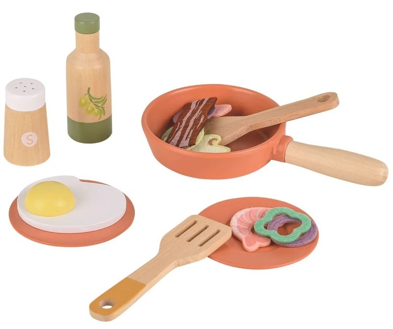Тази компактна кухня за игра е изработена от висококачествена дървесина и е идеална за по-малки пространства. Включени са тиган, солница, бутилка зехтин, 2 шпатули, 2 чинии, пържено яйце и 9 филцови фигурки, символизиращи бекон, лучени кръгчета, скариди и други.