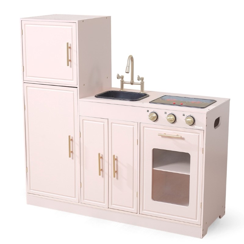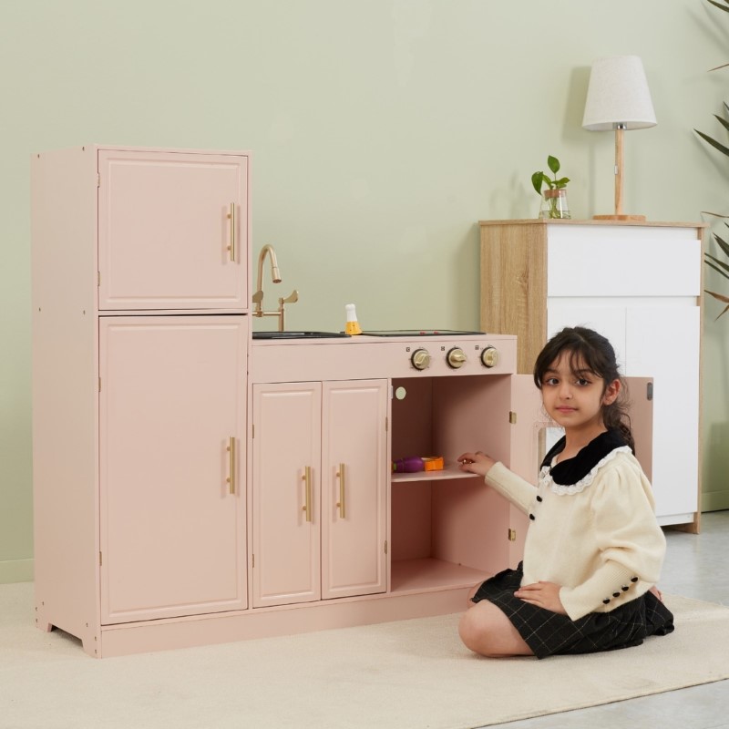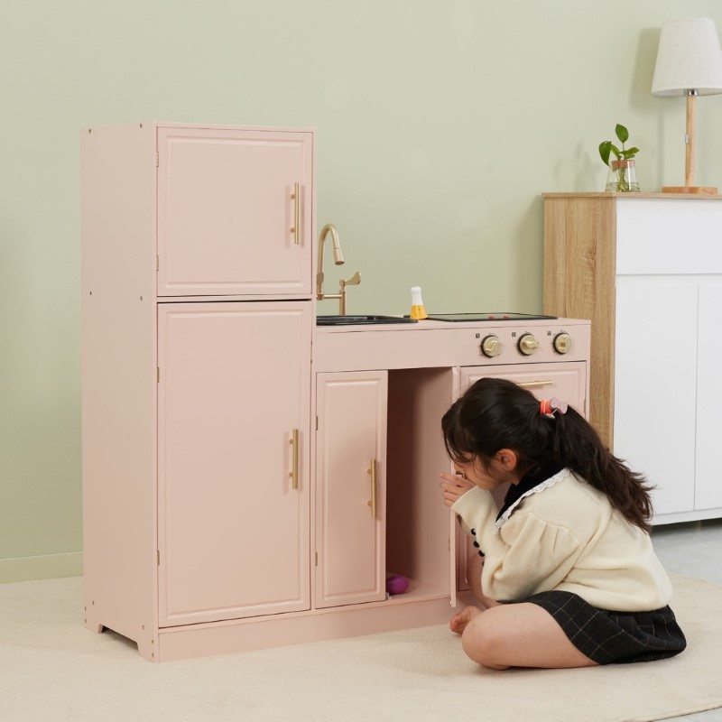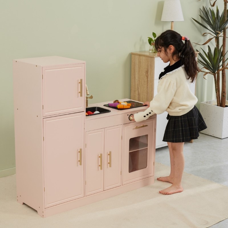 Детска дървена кухня в скандинавски стил и пастелен розов цвят, включваща хладилник, мивка, удобен шкаф, печка и фурна.