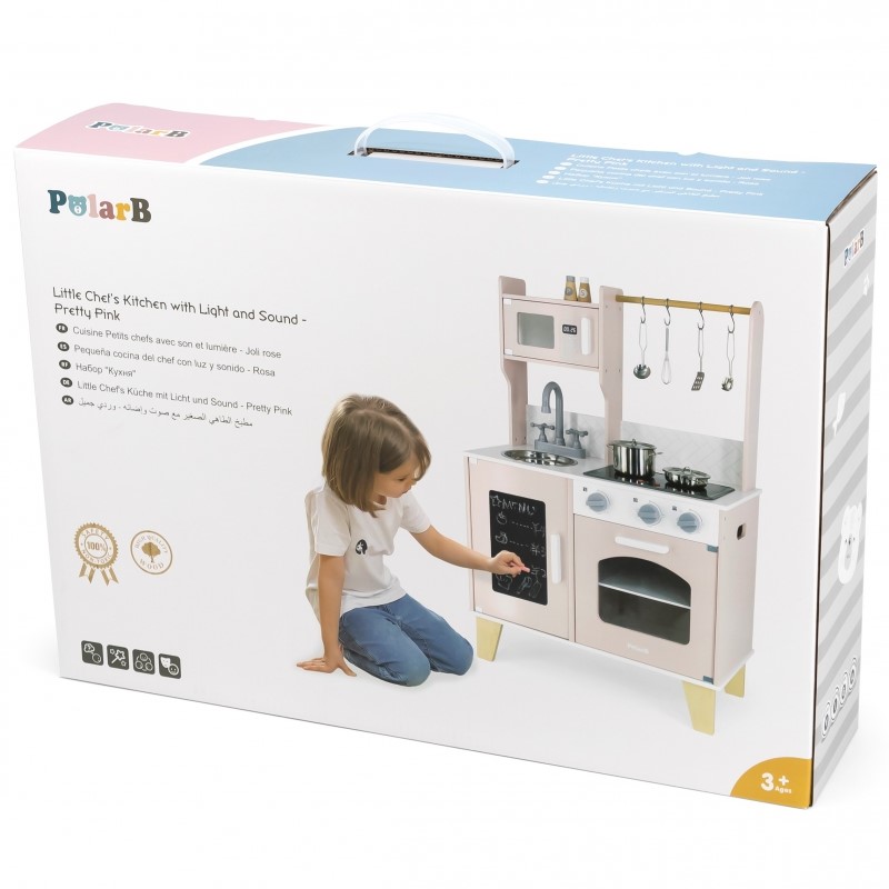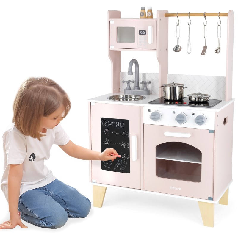 Стилна и модерна детска дървена кухня в пастелен розов цвят, включваща фурна, котлон, микровълнова печка, мивка и шкаф. Тя съдържа всичко, от което едно дете може да се научи да приготвя храна, да сготви нещо вкусно, след което да измие съдовете!