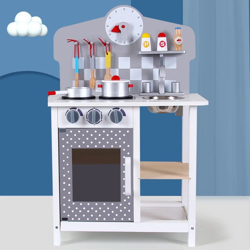 Детска дървена кухня с часовник, предназначена за малки Шеф готвачи. Кухненският комплект за игра разполага с фурна, 2 газови котлона, мивка и рафт за включените към нея съдове и аксесоари – тиган, тенджера, купа, бурканчета със сол и пипер, бутилка с доматен сос, комплект с бъркалки