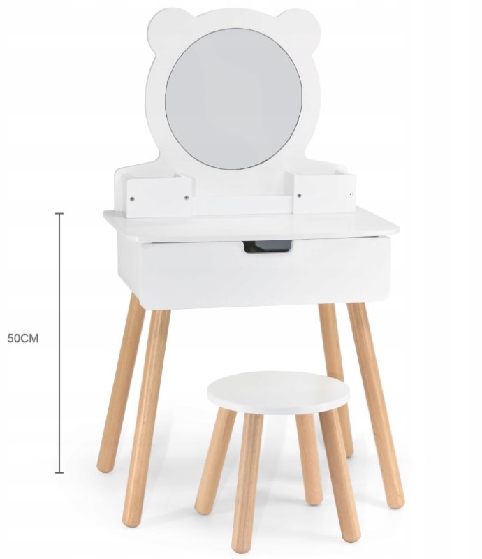 Тоалетката разполага с издърпващо се чекмедже, в което малката Ви принцеса може да скрие своите козметични принадлежности и гримове. Под самото огледало има отделения за удобни аксесоари.