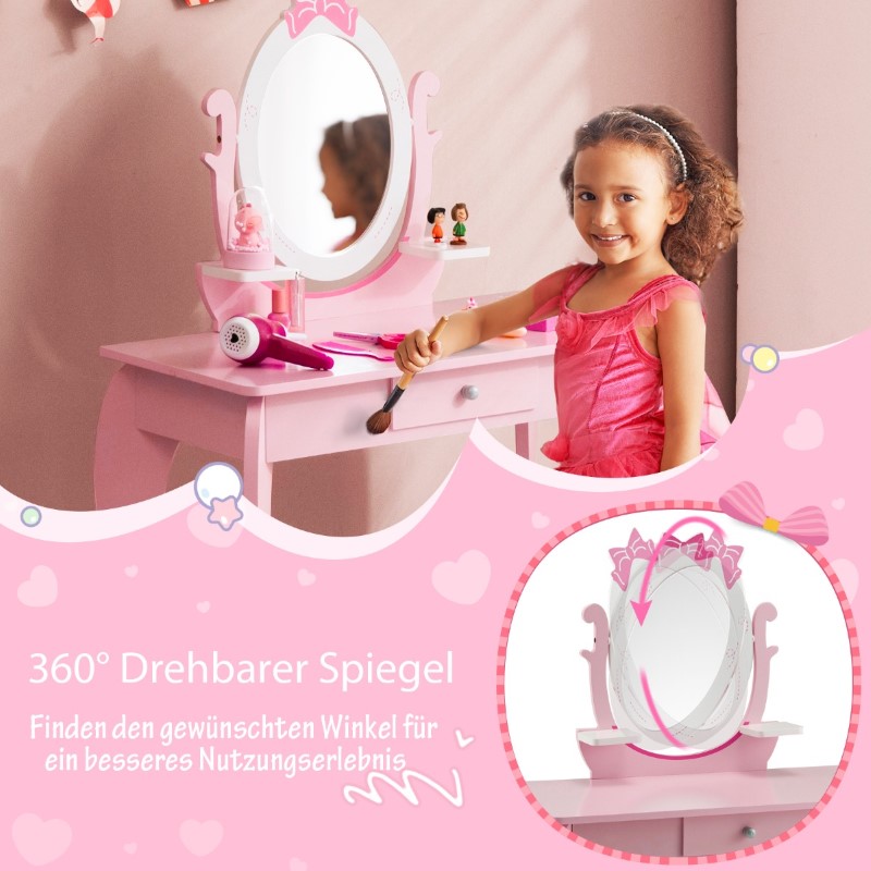 Детската тоалетка е проектирана с гладки и заоблени ъгли за безопасността на децата. В допълнение, здравите извити крака и подсилената структура допринасят за стабилност и безопасност. Въртящото се на 360° огледало позволява на децата да намерят желания ъгъл за по-добро потребителско изживяване.