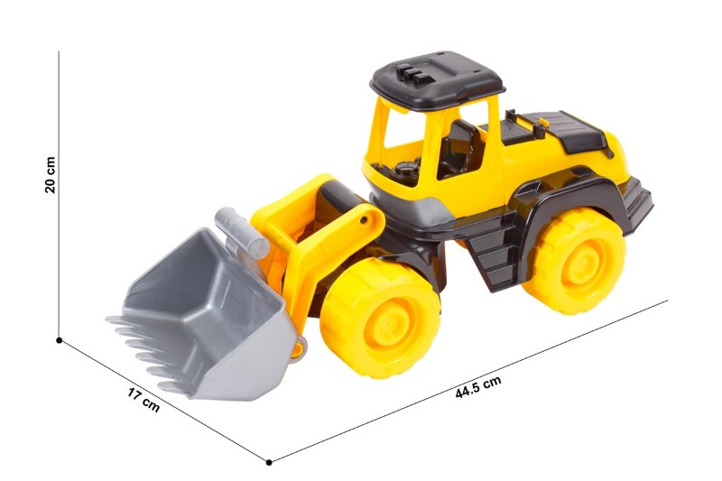 Детска фадрома с подвижна лопата за товарене на чакъл, пясък и други строителни материали. Можете да организирате различни ролеви игри както на закрито, така и навън. Тракторът ще бъде полезен за изграждане на пътища, мостове и паркинги. Детето ще се почувства като истински строител.
