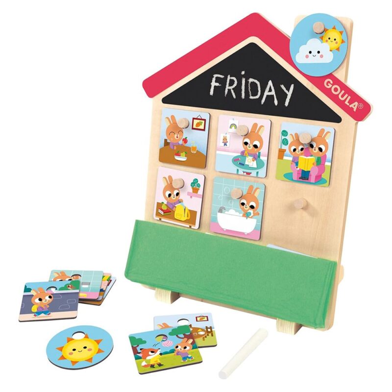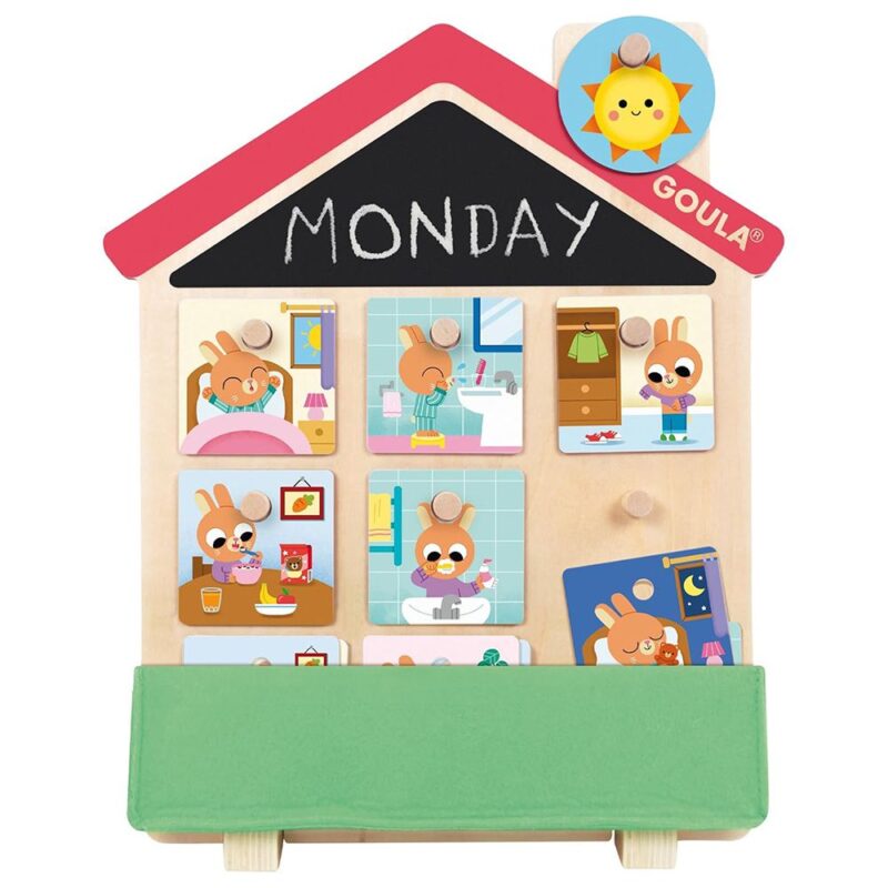 Сглобете дървената къща, напишете деня от седмицата на дъската и организирайте задачите си.
