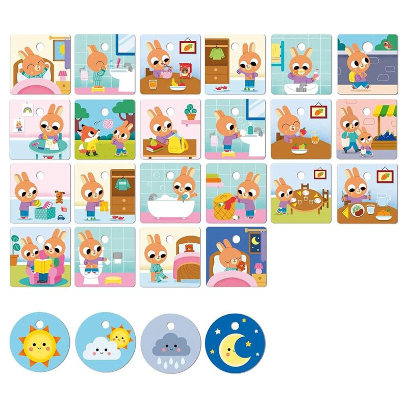 Играта включва 22 карти с различни рутинни навици, които децата от 3-годишна възраст могат да изпълняват в ежедневието си: миене на зъбите, ходене на училище, игра, подреждане на масата, писане на домашни.