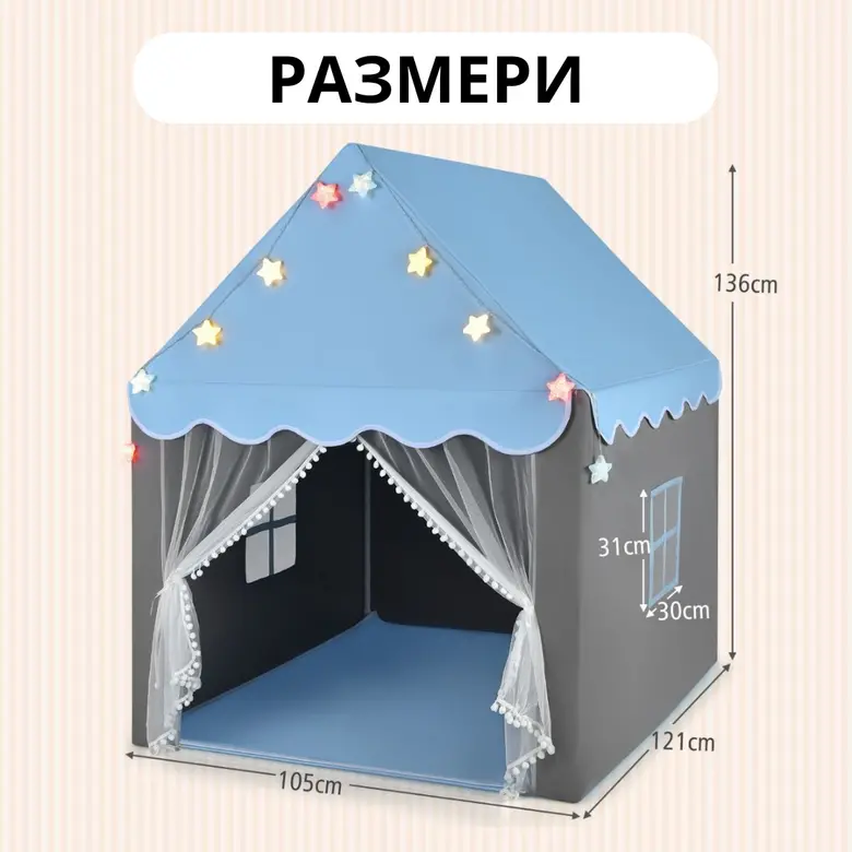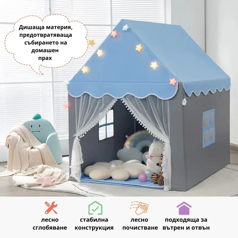 Тази красива къщичка със светлини ще допринесе за уюта и комфорта на децата ви в тяхната детска стая. Тя ще се превърне в любимото им място за игра, четене и отдих. Изработена е от PVC тръби, които образуват здрава и стабилна рамка, а платът с който се покрива е от полиестер и памук, което я прави мека и антистатична. Къщата разполага и с два мрежести прозореца, през които влиза въздух и мрежеста завеса, която предпазва от комари, ако се изнесе навън на двора.