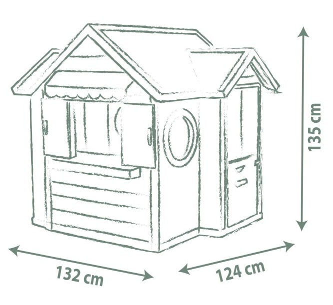 Къщата е произведена във Франция от изключително здрава, UV-устойчива пластмаса и е много стабилна, устойчива на цветове и издръжлива.