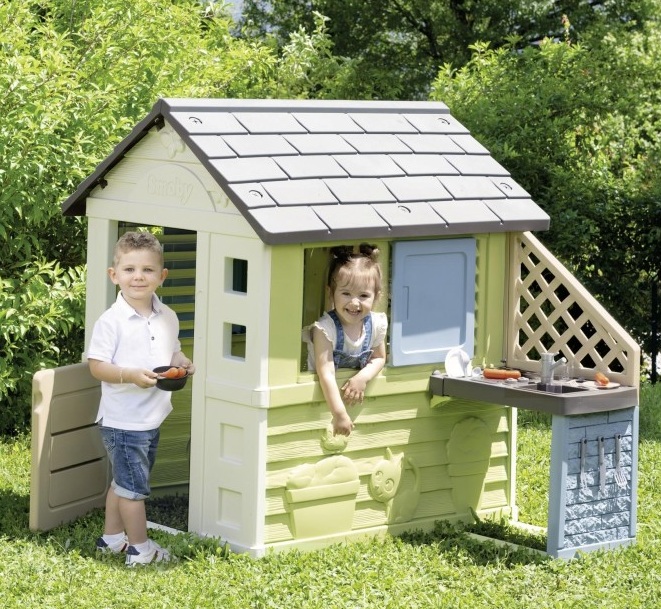 Красива къща за игра от Smoby Life Pretty, изработена от 50% рециклирана пластмаса, която предлага много забавление за малчуганите със своята фантастична лятна кухня.