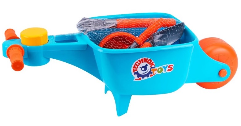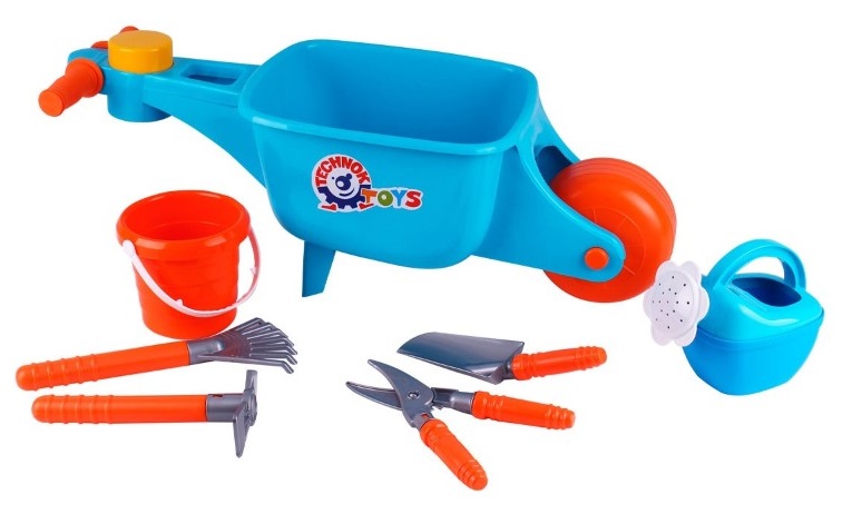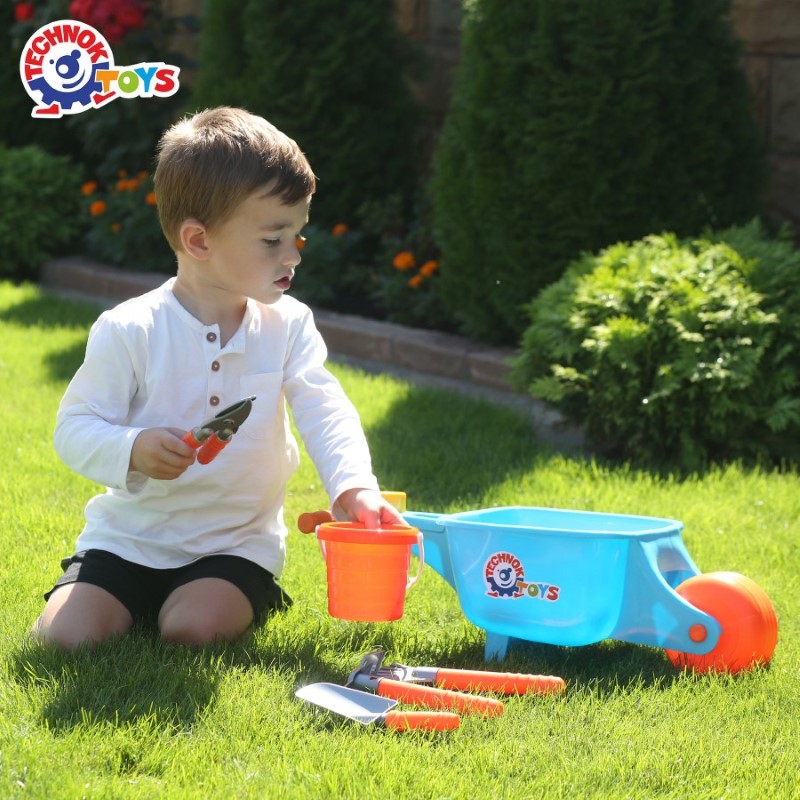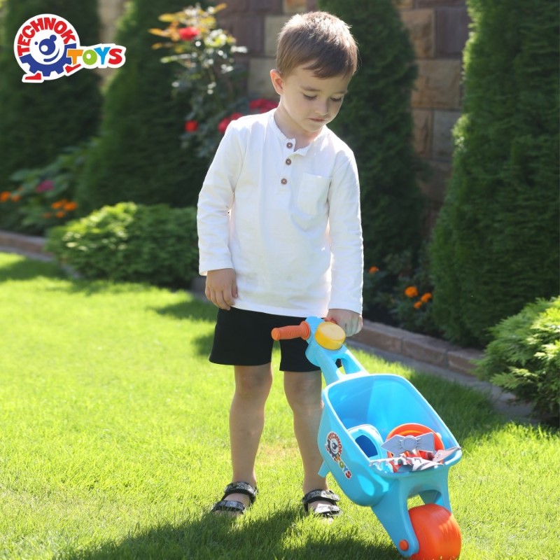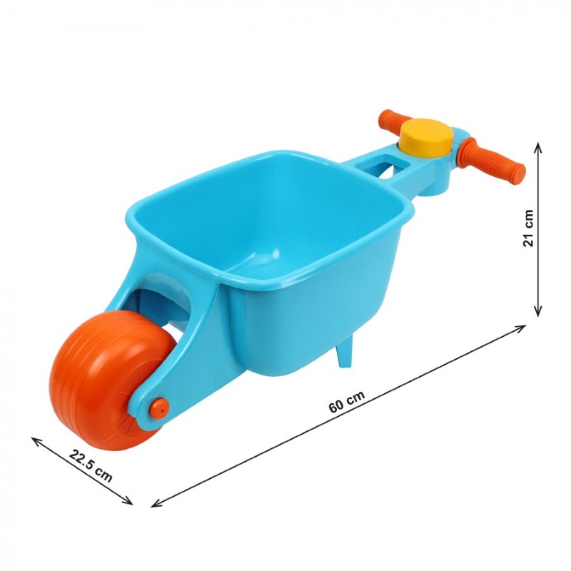 Детска количка в син цвят с голямо здраво колело и меки гумирани дръжки и комплект с градински инструменти, които ще послужат на децата в градината. Дизайнът я прави устойчива на преобръщане по време на завои, спускания или изкачвания. В количка можете да транспортирате ябълки, събрани в градината, листа, пясък или дори и играчки.