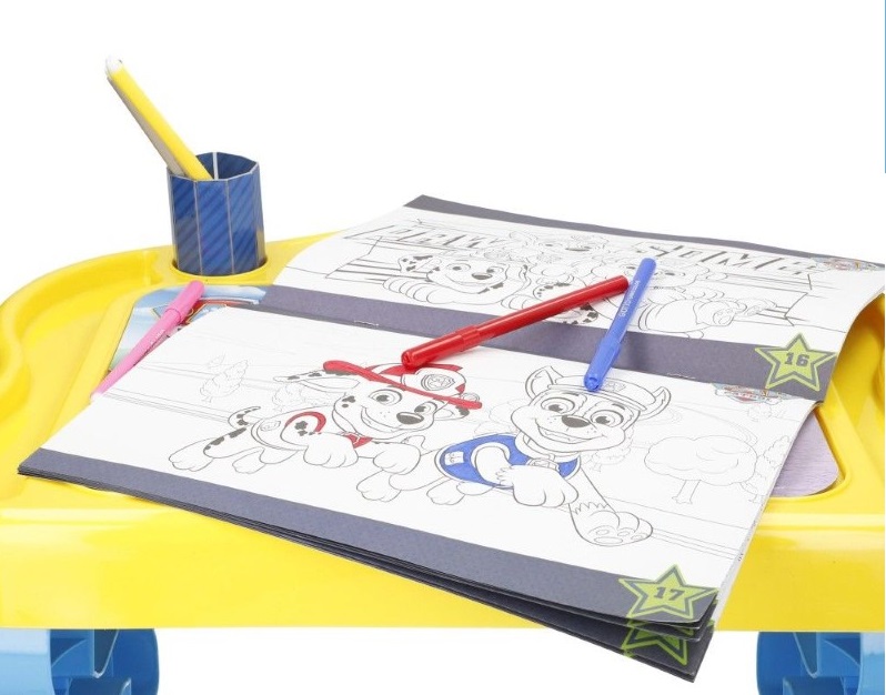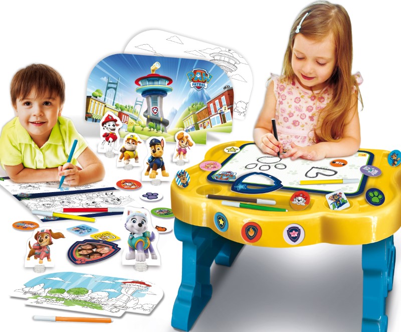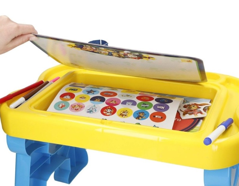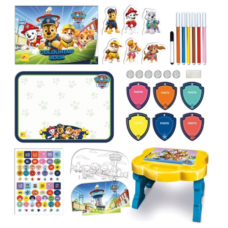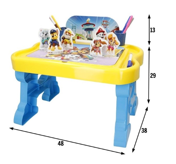 Масата включва подвижна бяла дъска с маркер и гъба, върху която може да се пише и изтрива колкото пъти искате, цветни маркери, 1 книжка за оцветяване и стикери. Освен това включва декоративни елементи като двустранна сцена, която може да се оцветява от едната страна, 6 рамки за снимки и 6 фигури на героите от Paw Patrol.