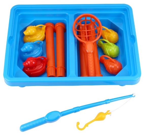 Комплектът включва и различни аксесоари за истински риболов: въдица с плувка, голяма мрежа за риболов, цветни рибки и патици. Децата трябва да тренират и да показват голяма ловкост, ако искат да хванат риба на куката. Такива игри тренират добре двигателни умения, внимание и координация. Цифрите могат да се използват и за изучаване на цветове и трениране на умения за броене.
