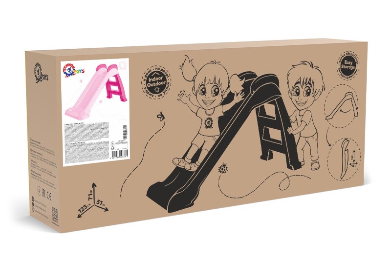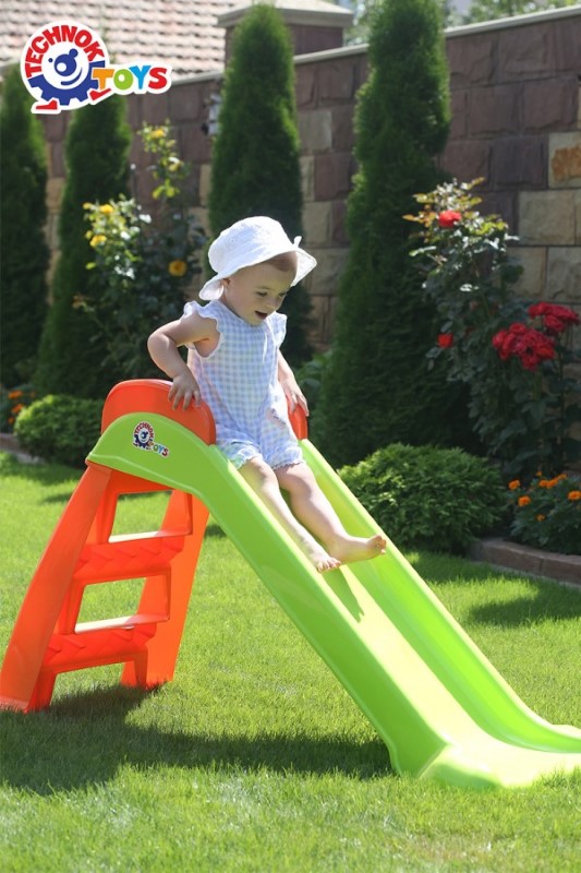Детска пързалка от Technok Toys, която се сглобява лесно у дома или на детската площадка и може да се разглобява и сгъва при нужда. В разглобено състояние стълбата се закрепва към пързалката със специални куки. В този си вид ширината му е само 24 см, което го прави удобно за поставяне в близост до гардероб или килер.