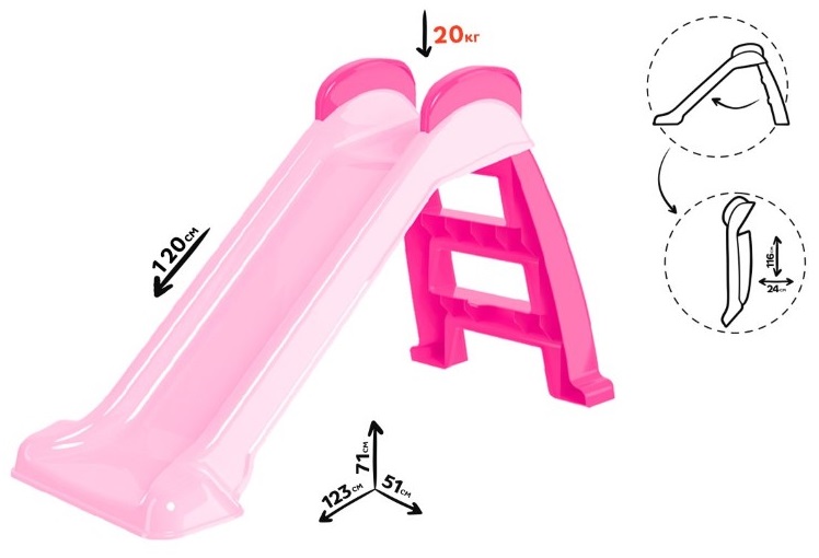 Пързалката е изработена от здрава, висококачествена пластмаса без мирис. На слайда няма остри ръбове. Ярките цветове не избледняват на слънце.