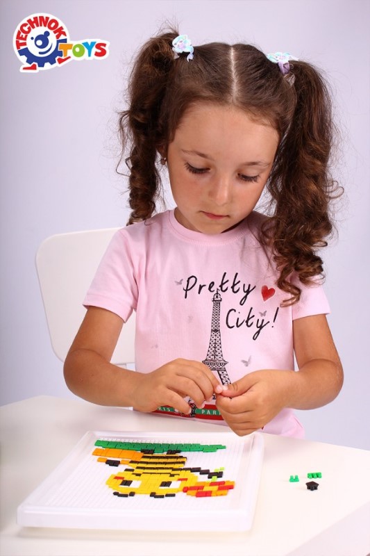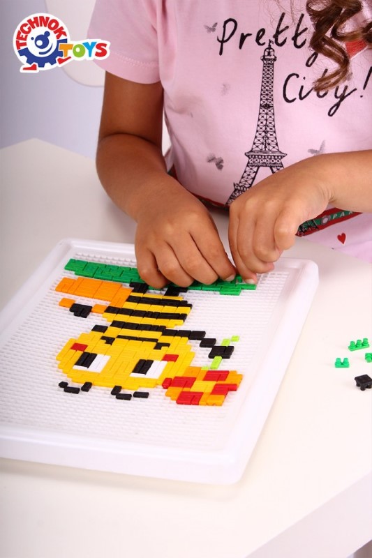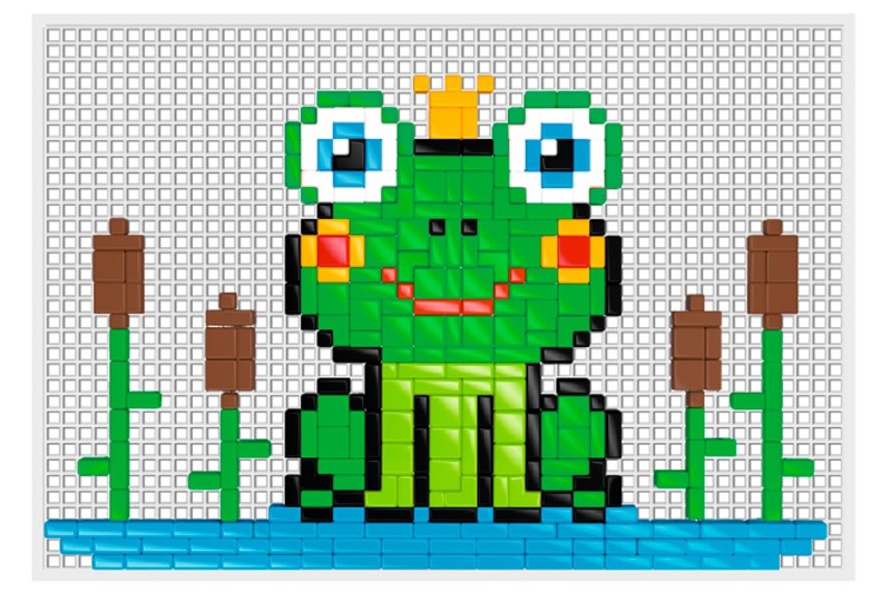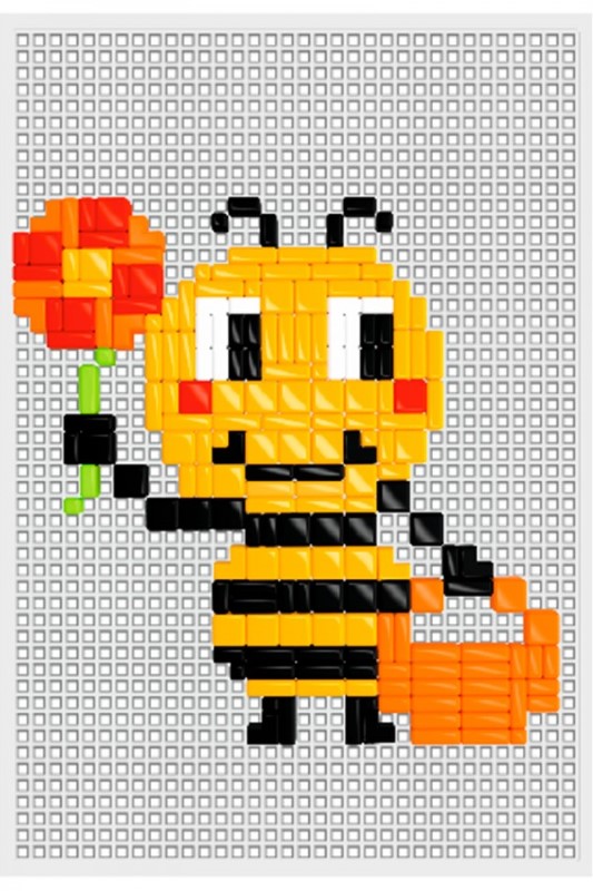 Тази пикселна мозайка е като бродерията, картината е разположена върху пластмасов шаблон с малки чипове с различна форма. Комплектът включва общо 1188 елемента в 9 цвята! Размерът на най-малкия квадрат е 4 х 4 мм. Има и специален инструмент за подпомагане на децата, който е удобен за отстраняване на чипове от шаблона. За малките творци в комплекта има инструкция, според която можете да сглобите 2 картини: ярка пчела и жаба принцеса. Можете също така да сглобявате картини от вашето въображение.