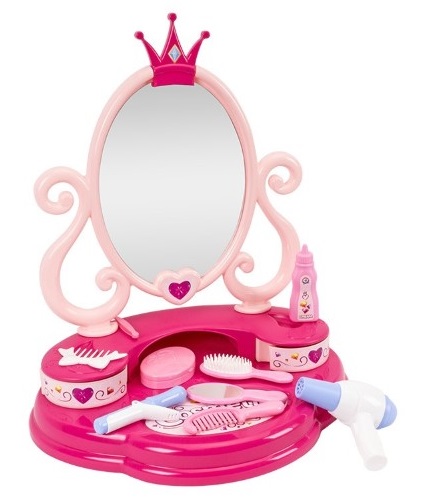 Детска тоалетка с голямо огледало, която ще се превърне в любимо място за игра на всяко момиченце. Тази стилна тоалетка има голям плот с огледало, който позволява на детето ви да бъде стилист или фризьор, да прави прически и грим.