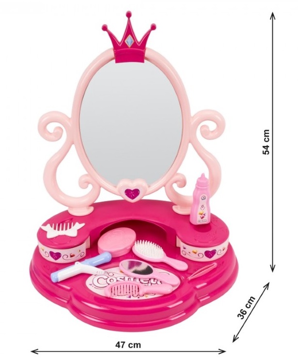 Предимство е голямото огледало с ширина – 21,5 см и височина – 31 см, което отразява реалистичен образ на вашето мъниче благодарение на висококачествено безопасно покритие. Друго предимство на тоалетката са нейните 2 малки чекмеджета, в които можете да поставите всичко необходимо, а благодарение на размера е възможно да преместите масата на друго удобно място след края на играта. Масата е изработена от висококачествена пластмаса без мирис.