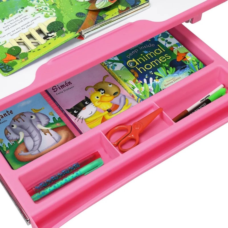 Височината на бюрото и стола се регулира, което помага на децата да имат перфектна поза при седене. Работният плот на ученическото бюро може да се накланя от 0-40° ъгъл, за да защити зрението им. Бюрото разполага с вградено изтеглящо се чекмедже за съхранение на химикалки, книги, хартия и други дребни пособия.