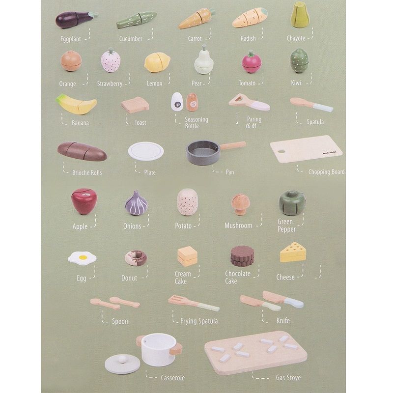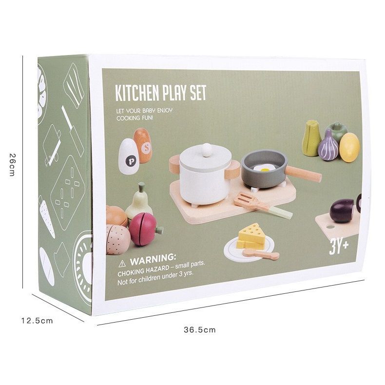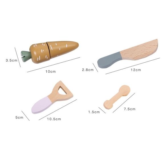 Този прекрасен дървен кухненски комплект насърчава ролевата игра и помага за развитието на фините двигателни умения. Той е идеален размер за малки ръчички, така че децата да могат да ги нарязват внимателно и точно с дървен нож. Също така чудесен начин да ги научите за безопасността в кухнята. Идеално допълнение е за всяка детска кухня, ресторант, супермаркет.