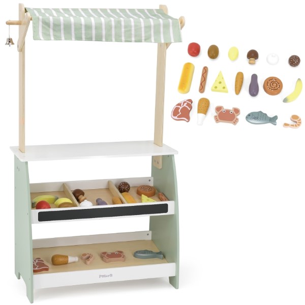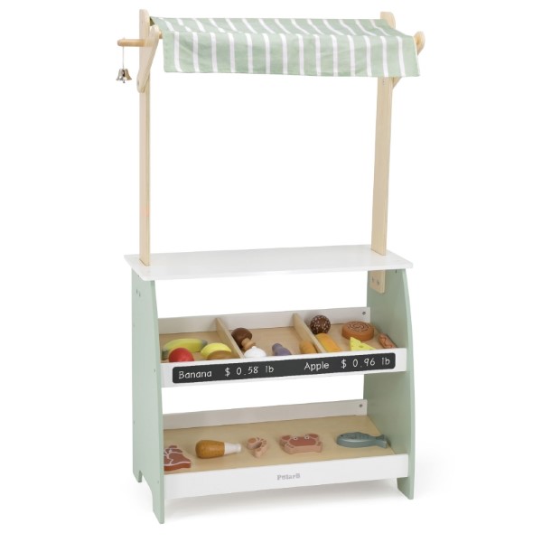 Когато отворите своя магазин за хранителни стоки трябва само да поставите продуктите на рафтовете, като в комплектът са включени дървени плодове, зеленчуци и различни видове месо, а на черната дъска можете да пишете с тебешир оферти за деня или отстъпки. Щандът е достатъчно просторен, за да поставите както стоките, така и касов апарат или кантар.