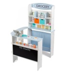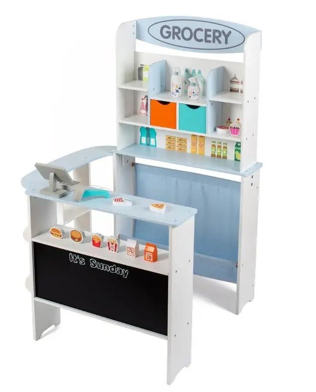 Детски дървен магазин, в които можете да откриете различни продукти, които се предлагат в един супермаркет. Магазинът е оборудван с подвижни дървени рафтове и чекмеджета, касов апарат със скенер, хранителни продукти и други аксесоари. Децата ги очакват многобройни ролеви игри и ще се превърнат в истински търговци или купувачи.