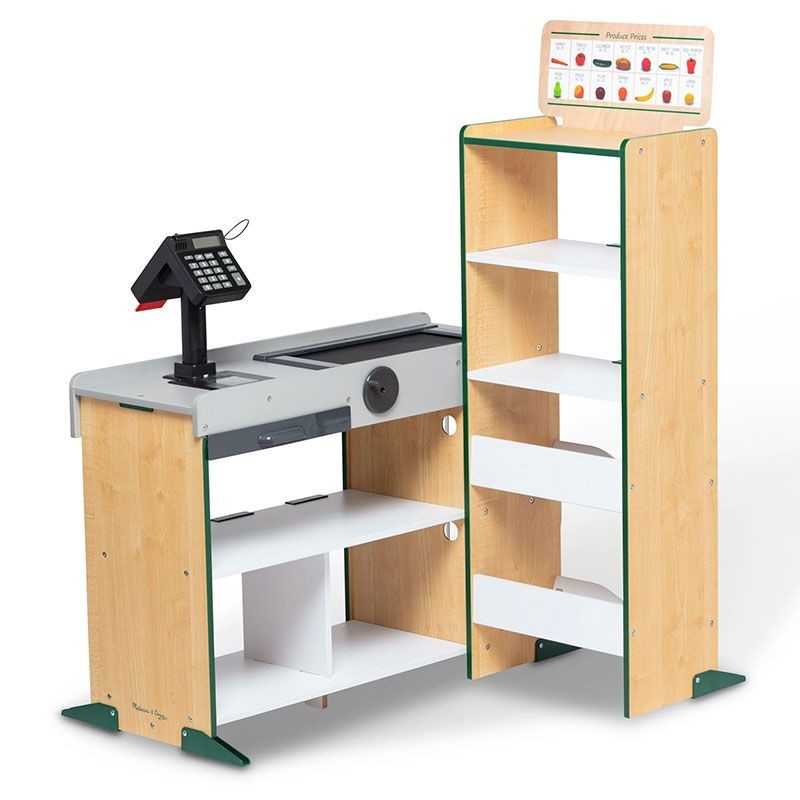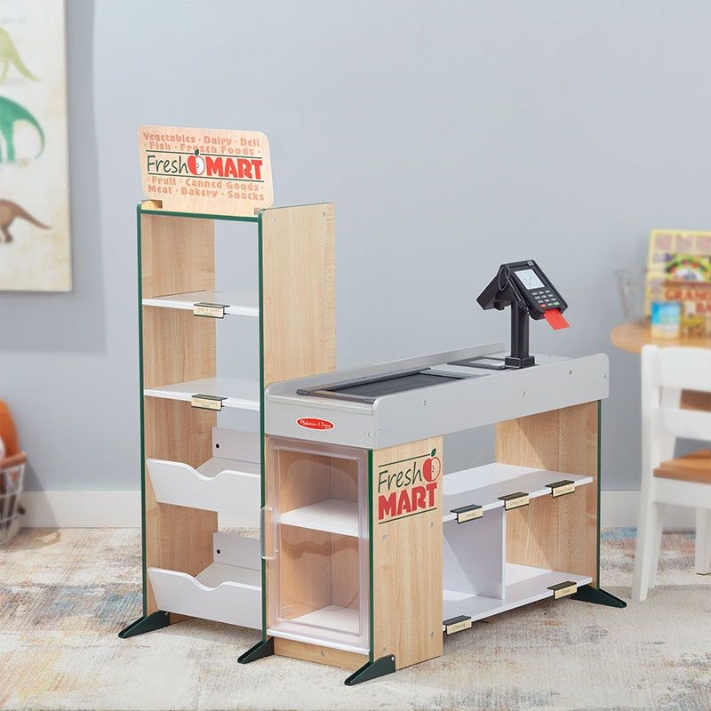Детският дървен супермаркет Магазин Фреш от Melissa and Doug предлага реалистично и увлекателно преживяване за пазаруване и ролеви игри. Стабилната конструкция с гладки, извити ъгли и безопасни ръбове позволява на децата да се преструват на клиенти или продавачи, като стимулира въображението, социалните умения и фината моторика. Комплектът включва интерактивни елементи, които правят играта още по-ангажираща.