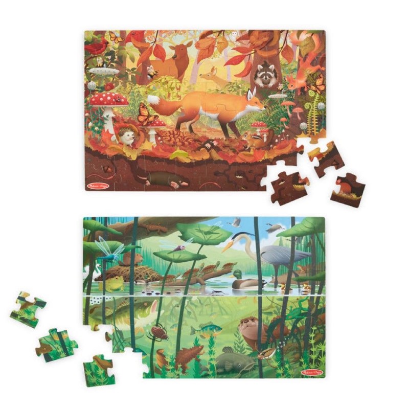 Пъзелът се състои от 48 големи части и е двустранен, като предлага две различни природни сцени. От едната страна е изобразена горска и подземна среда в оранжеви тонове, а от другата страна езерна и подводна сцена в зелени нюанси. След сглобяването децата могат да продължат играта чрез включените карти за търсене и намиране, както и лупа, която насърчава внимателното изследване на детайлите.