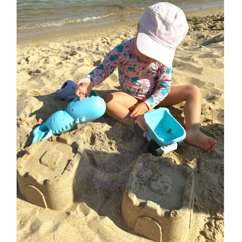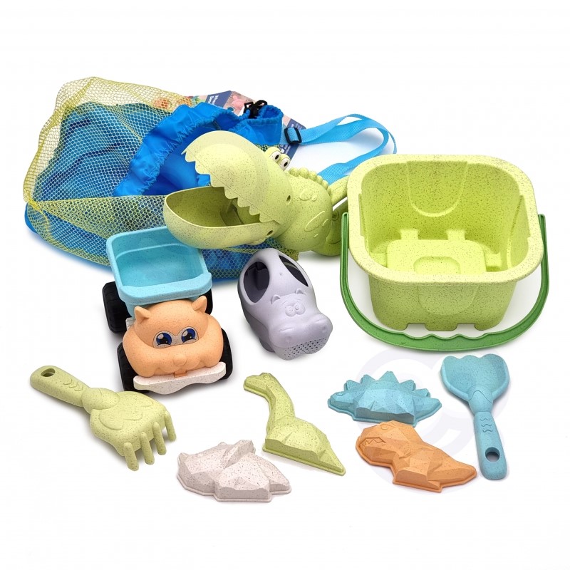 Този комплект за пясък на марката Woopie е чудесно допълнение към пясъчника или плажа. Изработен в топли пастелни цветове от органичен, биоразградим материал.