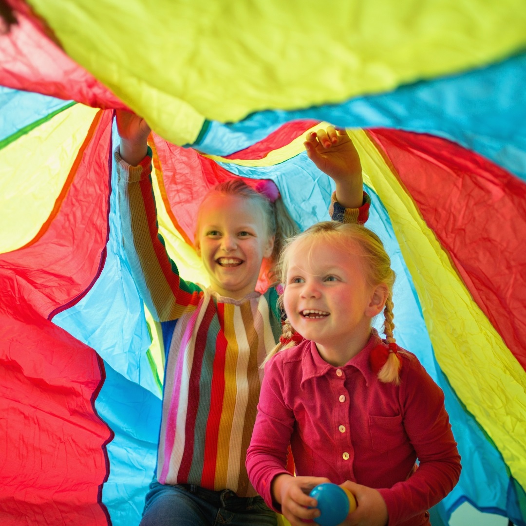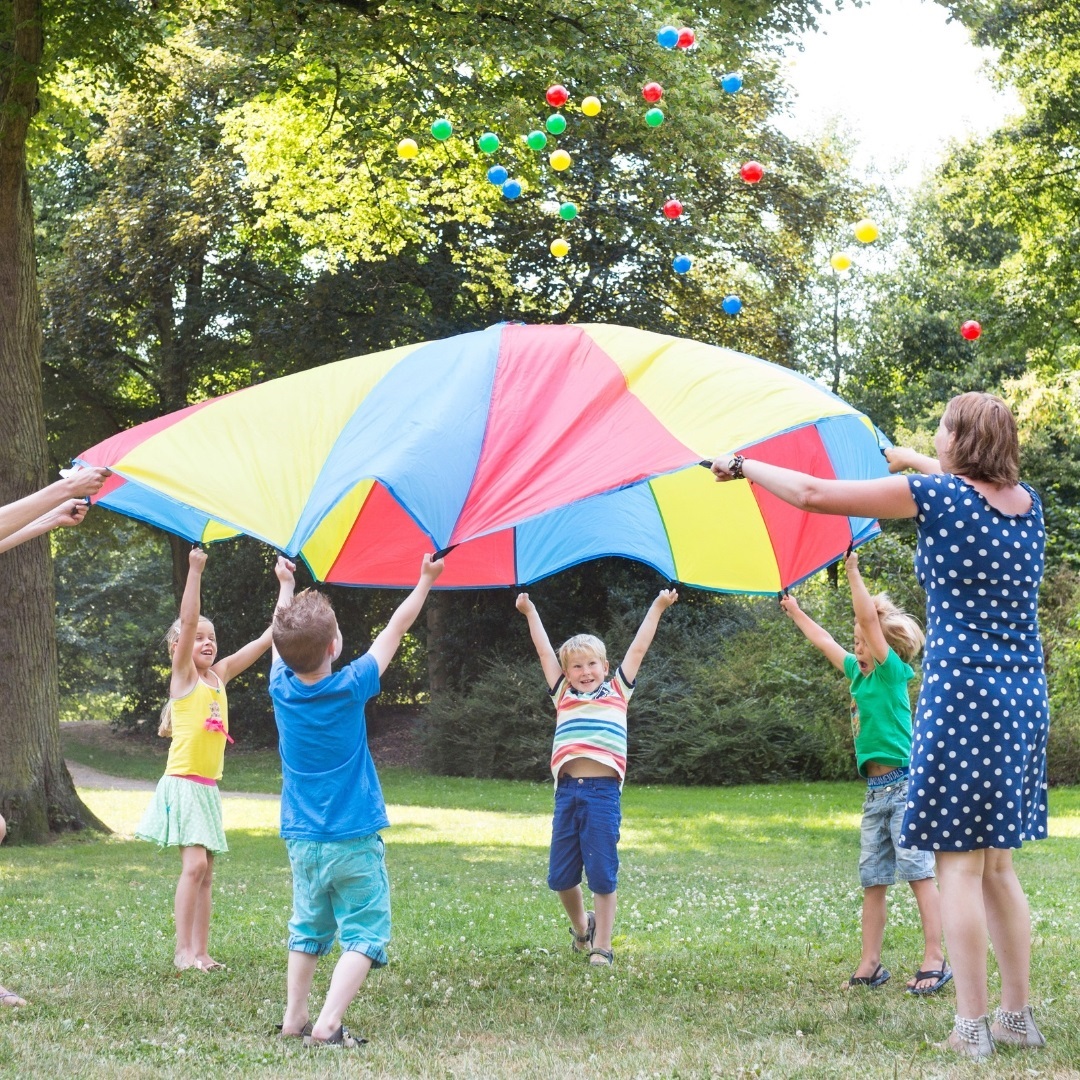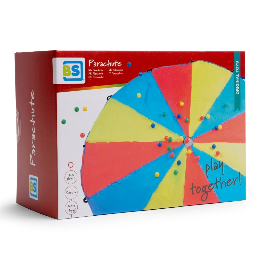 С тази играта с парашут, децата могат да се забавляват и същевременно да научат много, като основни движения и реакции на тялото. Играта осигурява упражнения за ялото тяло за всички възрасти и е прекрасен начин за развитие на основна физическа координация. Изработен от пъстър и лек полиестер с много здрави дръжки, парашутът вдъхновява много различни дейности. Лесно се прибира и съхранява.