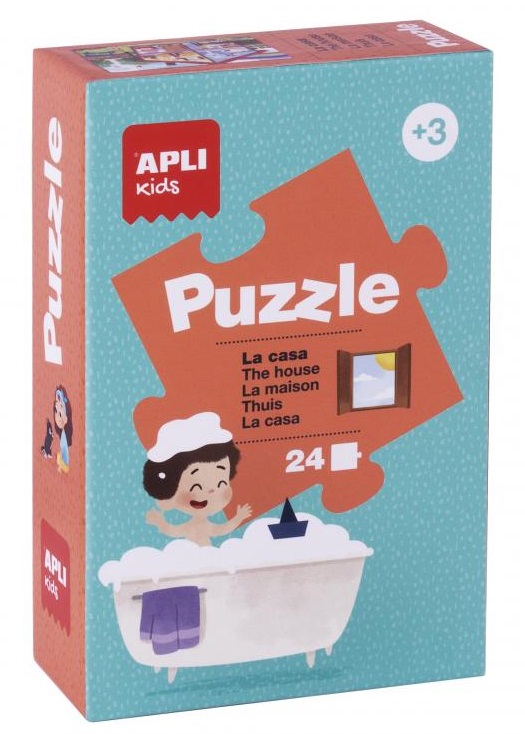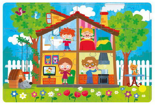 Детски образователен пъзел, съдържащ 24 ламинирани елемента с размер 7 х 7 см, с които децата ще могат да играят и ще се научат да разпознават стаите в къщи, както и ще придобият визуална представа какво се прави във всяка една стая. Спомага и за научаване на нови думички.