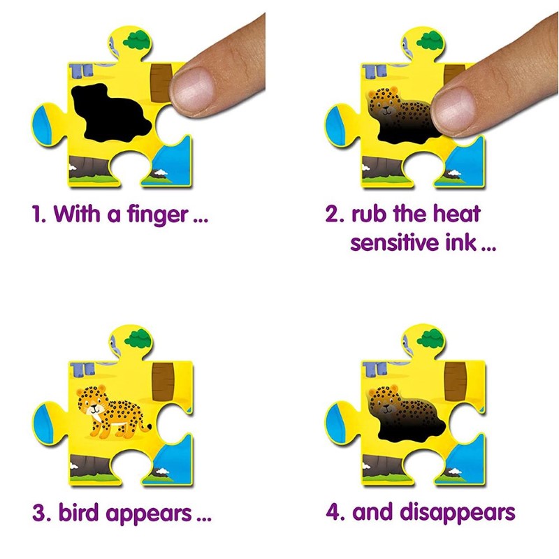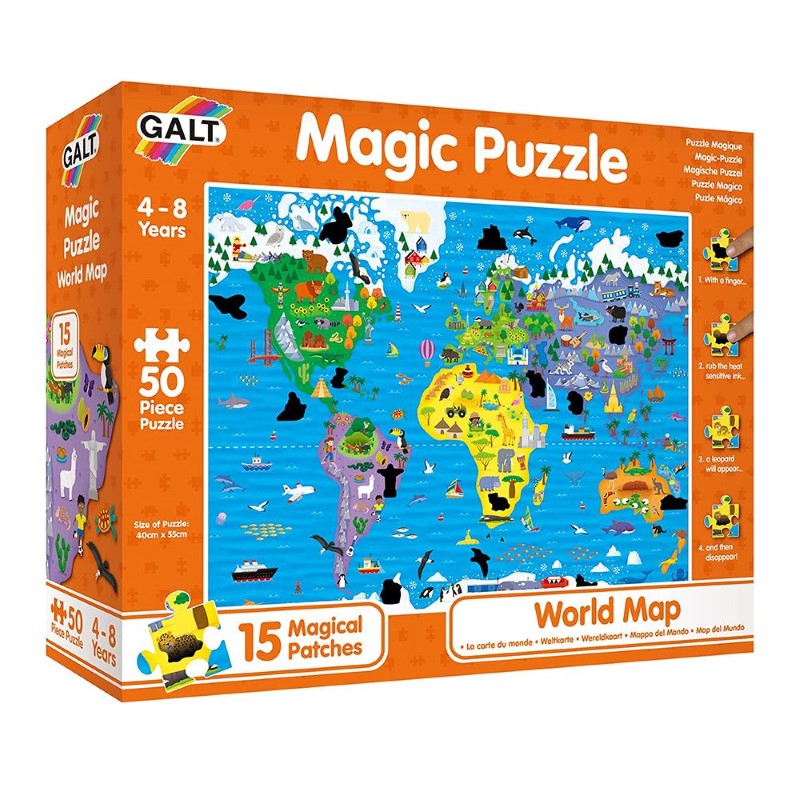 Пъзелът е с 50 части, които трябва да се подредят и има включено допълнително забавление, което включва 15 лепенки за триене с черен фон, които децата ще трябва да разкрият след като наредят пъзела. Те ще намерят скритите снимки на континенти, животни, сгради и предмети, типични за всеки континент. След известно време обаче открития участък отново почернява и появилото се изображение изчезва. Магическите пъзели носят допълнително вълнение в сравнение със сглобяването на традиционен пъзел.