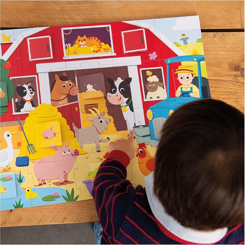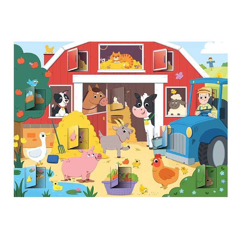 Пъзелът е във формата на ферма и има 10 прозорчета, които скриват различни животни. Децата ще трябва да открият къде се крият животните, като повдигат прозорчетата.