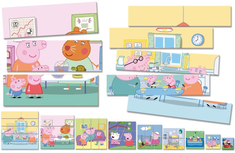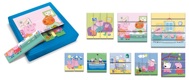 В комплектът ще намерите 8 пъзела с различен брой елементи, което позволява на детето постепенно да развива умения за нареждане на пъзели, от лесни до сложни. Благодарение на нарастващото ниво на трудност и увеличаващия се брой елементи, детето може да развие своите ръчни умения и умение за асоцииране. Пъзелът е базиран на любимото анимационно филмче на Peppa Pig.