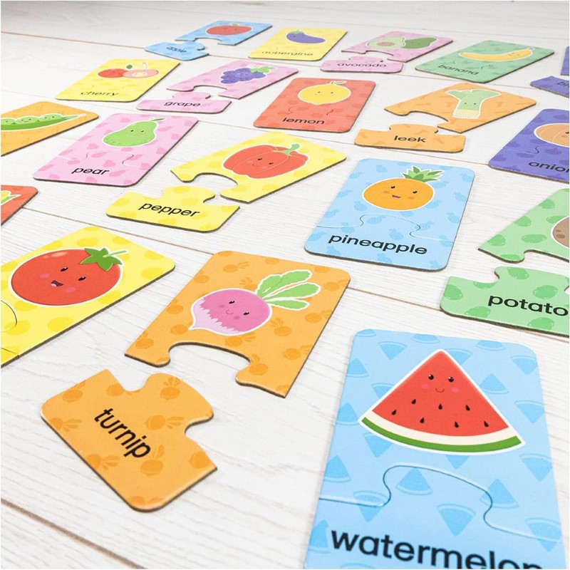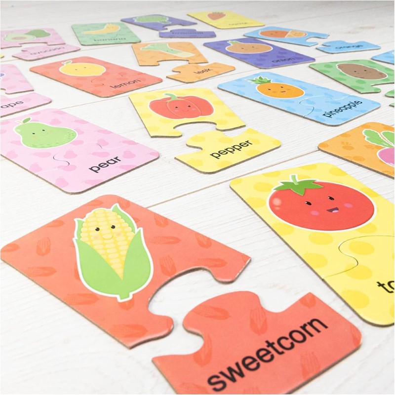Всеки пъзел се състой от две части, които съдържат имената на плодовете и зеленчуците с илюстрациите им. Частите са самокоригиращи, така че ще паснат заедно само когато бъде намерена съответстваща двойка. Докато търсят правилната част от пъзела, децата ще се запознаят с ябълка, авокадо, череша, царевица, чушка, диня, круша, грозде, домат и други.