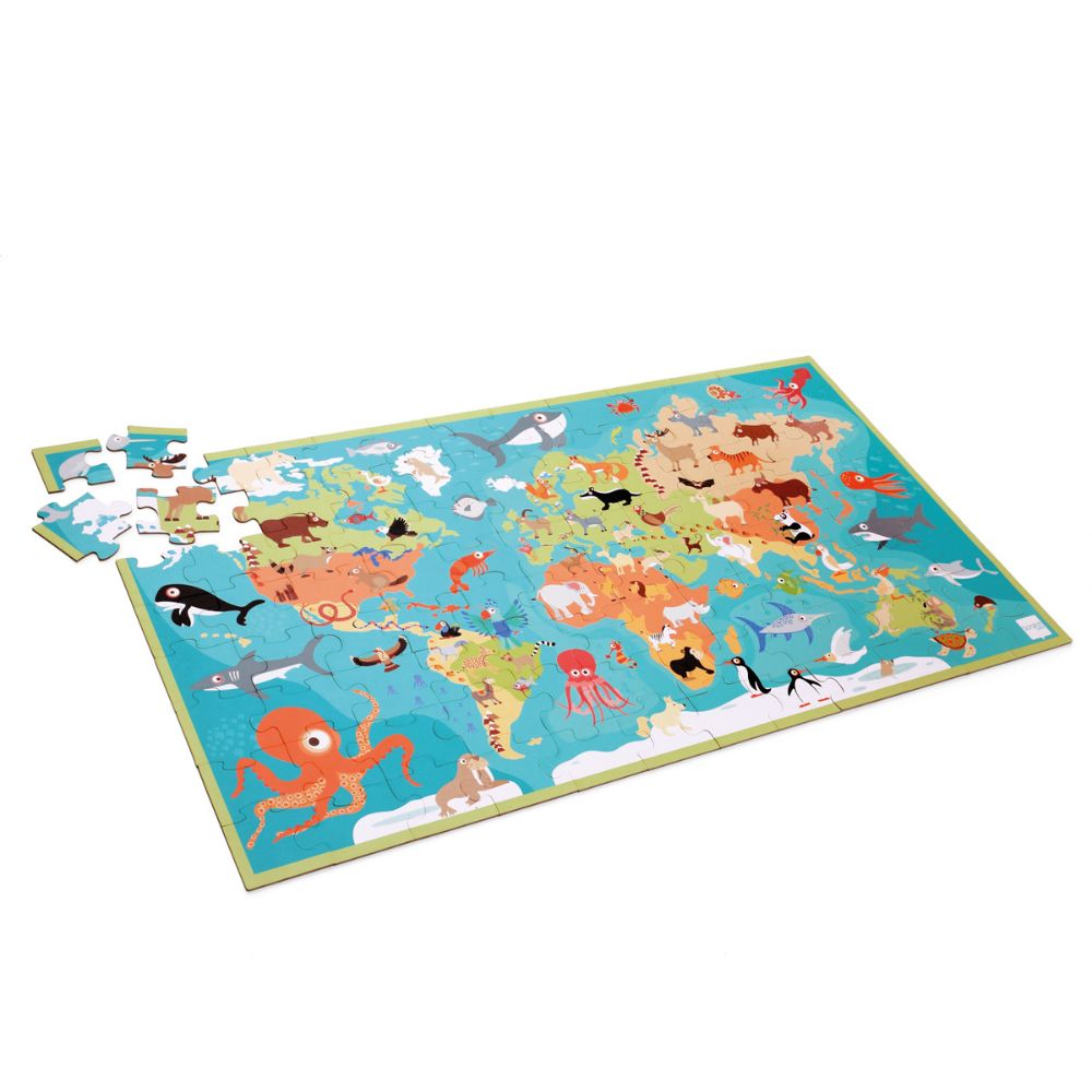 Те ще трябва да сглобят всички 100 части от пъзела едно по едно за да открият къде живеят животните по света, от полярни мечки на северния полюс до киви в Нова Зеландия. Забавните детайли в картината превръщат този пъзел в невероятна експедиция.