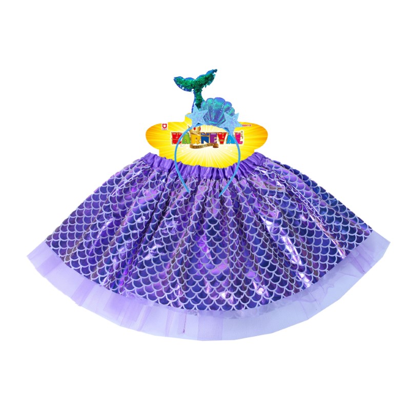 Сладкият и многоцветен костюм е предназначен за момичета на възраст от 3 до 7 години (104-130 см). Комплектът включва: финна елегантна пола в лилаво-син цвят имитиращ люспи на русалка и красива диадема украсена с миди и морски звезди. Костюмът стимулира ролевата игра.