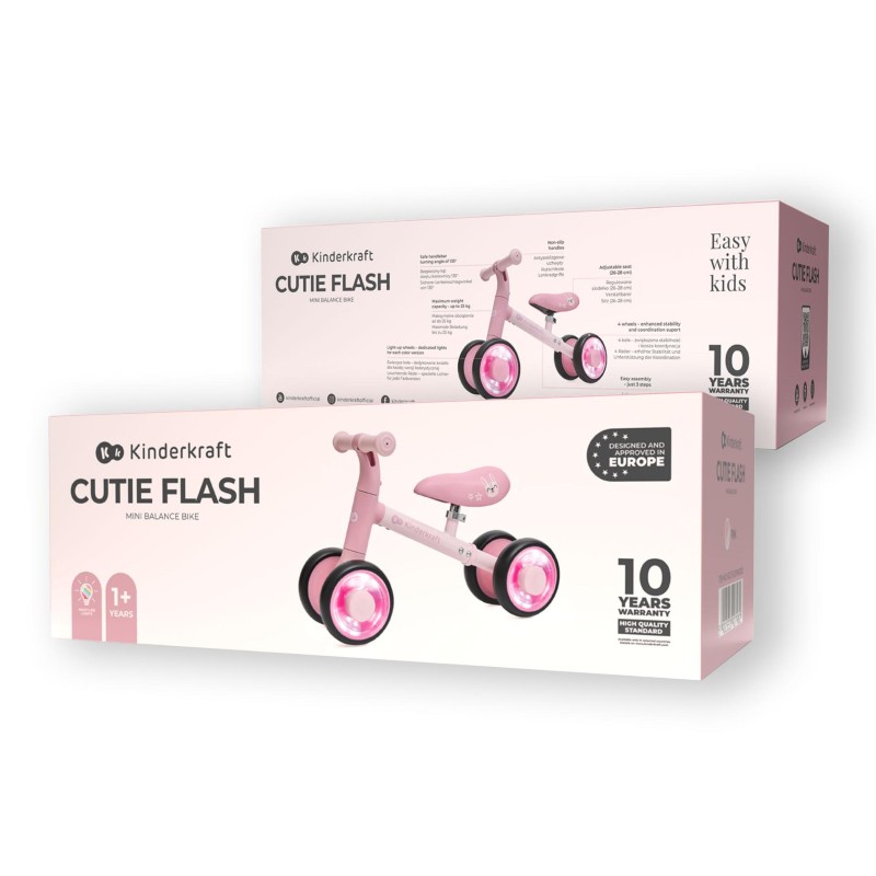 Детско колело от серията Cutie Flash на KinderKraft, което е подходящо за първото колело на вашето дете. Благодарение на четирите си гуми и здравата конструкцията на колелото, детето ви ще развие чувството за баланс докато кара и развитието на двигателните функции и координацията.