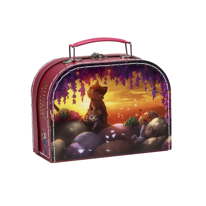 Куфарчето е изработено от висококачествен картон и стоманена дръжка. От външната страна на чантата има вълшебни илюстрации от приключенията на Макс и Хилиън. Вътре в чантата има етикет, на който детето може да напише името си, за да знаете на кого принадлежи. Сега детето е готово за всички приключения с Макс и Хилиън!