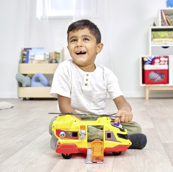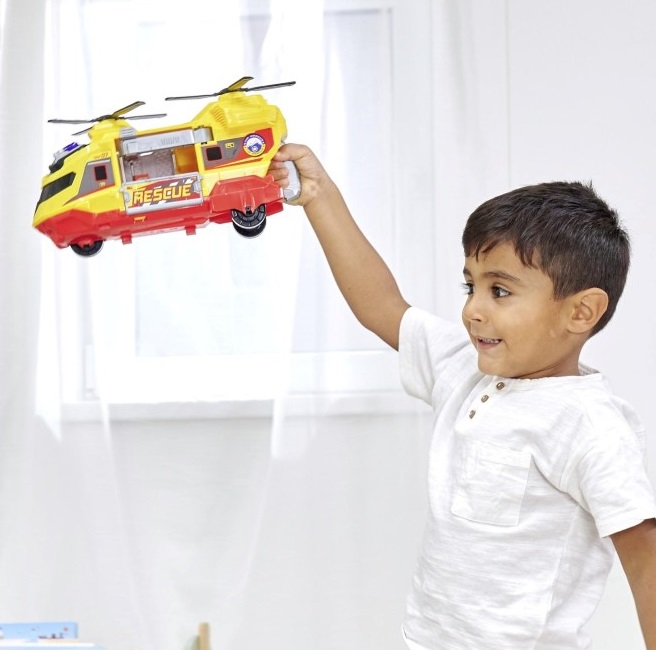Въпреки това, хеликоптера е напълно функционален и на твърда земя и бързо се придвижва към местоназначението си на колелата си за свободен ход. Реалистичните звукови ефекти подпомагат творческата игра на децата: със звуци на излитане на витлото, сирена и полет, както и мигаща синя светлина. Благодарение на включените батерии, въздушното спасително превозно средство е незабавно готово за използване, независимо дали е на земята или във въздуха!