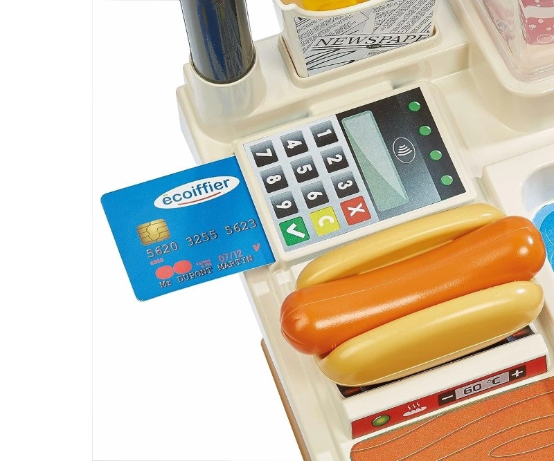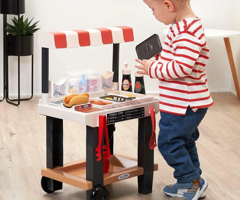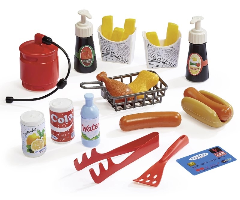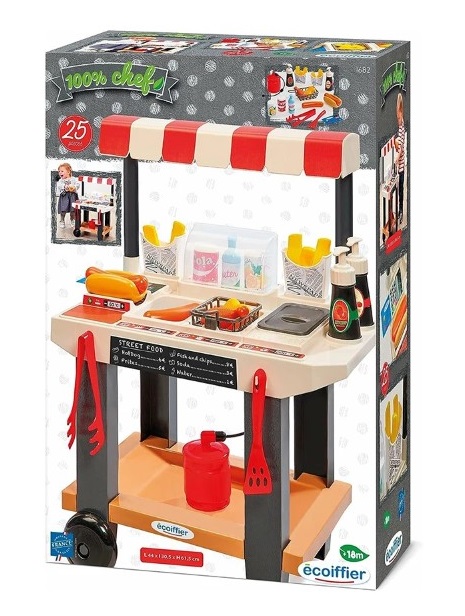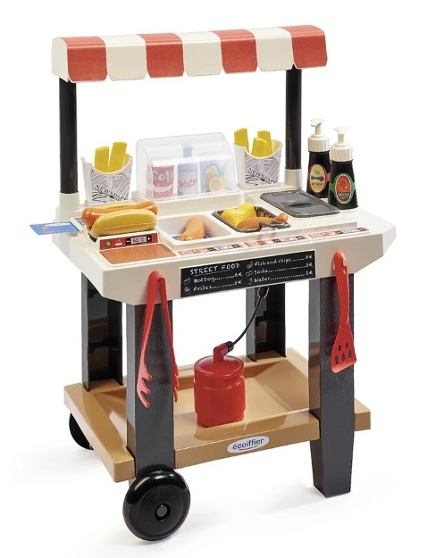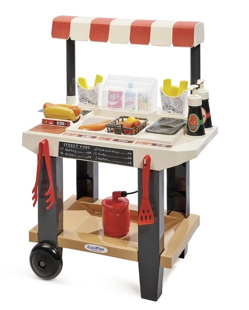 С модерната количка за бързо хранене от Ecoiffier, децата могат да влезнат в ролята на истински продавачи или клиенти и да приготвят или похапнат вкусни сандвичи с пържени картофки!