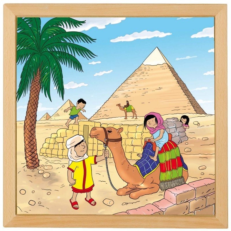 Детски пъзел съдържащ 81 дървени парчета, с които децата могат да си подредят красива картина от серията „Чудесата на света“ представящ египетските пирамиди.