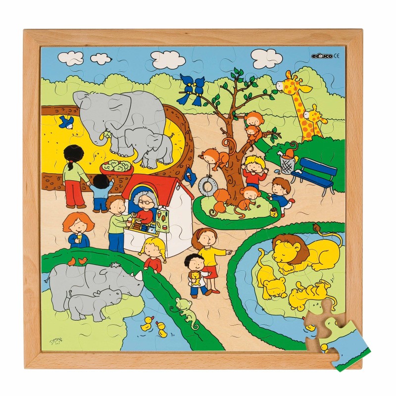 Детски пъзел съдържащ 64 дървени парчета, с които децата могат да си подредят красива картина на тема „Животните в зоопарка“.