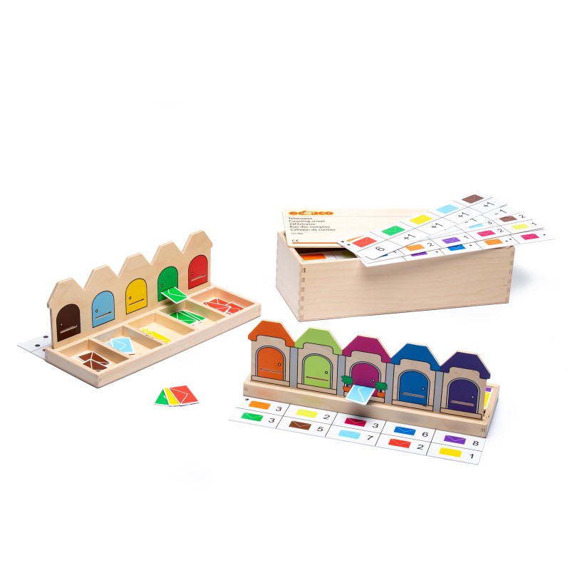 Комплектът съдържа: * 1 дървена кутия за съхранение, * 2 дървени поставки, * 2 дървени редици с къщи, * 16 пластмасови карти със задания, * 10 пластмасови карти с числа и точки, * 100 пластмасови писма в 10 цвята.
