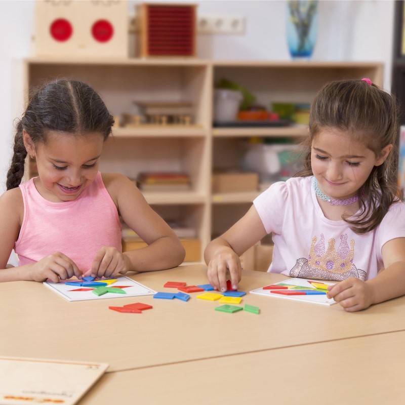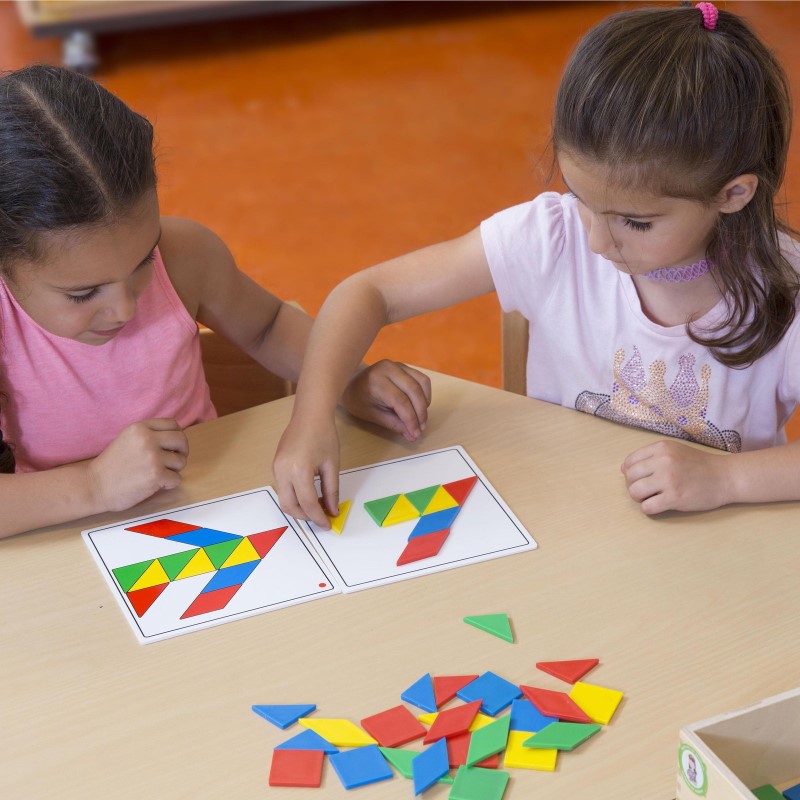 Комплектът съдържа: * дървена кутия, * 48 пластмасови форми, * 18 пластмасови карти със примери, * пластмасово обезопасено огледало.