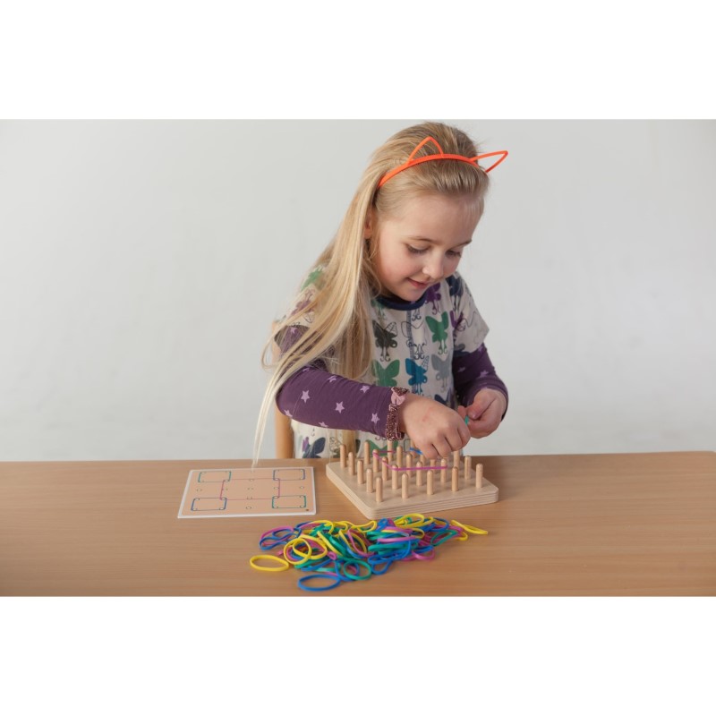 Целта на тази игра е детето ви да създава фигури, като поставя ластиците на поставката и по този начин открива какво представляват периметърът, площта, различните ъгли и още много други понятия. Детето може да използва картинките с примерите или да използва фантазията си, за да създава красиви форми и изображения.