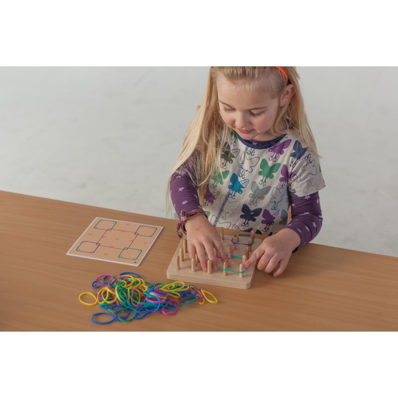 Комплектът съдържа: * 1 дървено табло за игра с 25 дървени колчета, * 6 картинки с примерни фигури, отпечатани и от двете страни, * 80 ластика в 4 цвята, * 1 дървена кутия за съхраняване.
