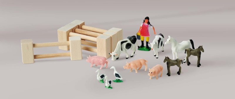 Комплектът включва 20 части, включително гъски, крави, прасета и коне.