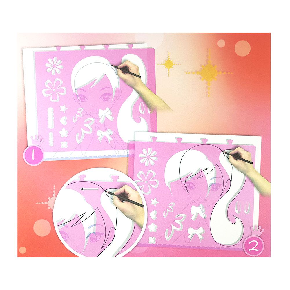 Детска книжка със спирала съдържаща 36 страници, с помощта на които детето ви може да пресъздаде различни рисунки със красиви модели, които след това може да декорира със стикери. Комплектът включва и 5 пластмасови шаблона за рисуване, 3 листа със стикери и 36 страници за творчески проекти.