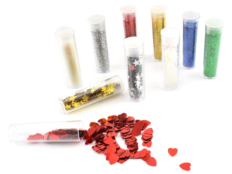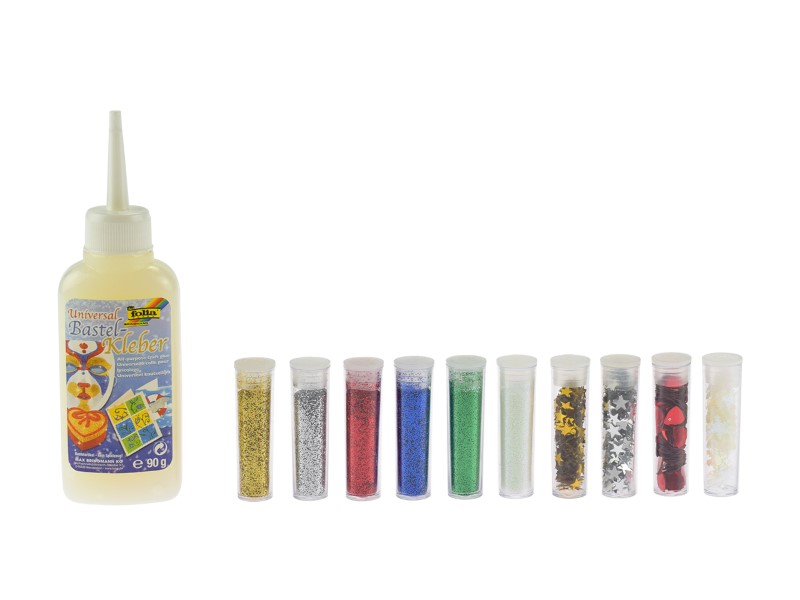 Съдържание на комплекта: 6 броя брокати с различни цветове, 2 шишенца със звезди в сребърен и златен цвят, 1 шишенце със сърца, 1 шише със звезди, 1 лепило 90 гр.
