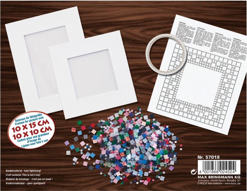 Този комплект ви дава възможност да изработите и украсите две рамки за снимки с помощта на малки парченца стъкло, керамика или камъни. Комплектът съдържа над 800 части – мозайка с различни по цвят, материя и форма парчета, 1 рамка за снимка с размери 10 х 15 см, 1 рамка за снимка с размери 10 х 10 см, книжка с инструкции.