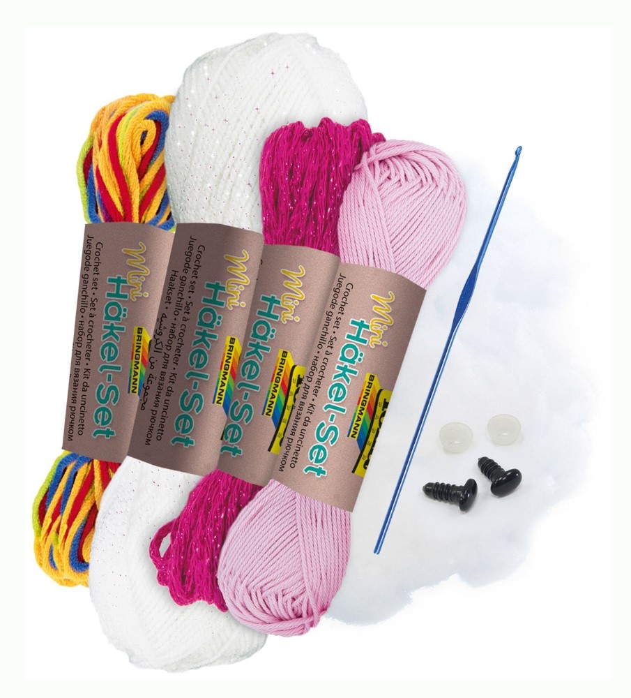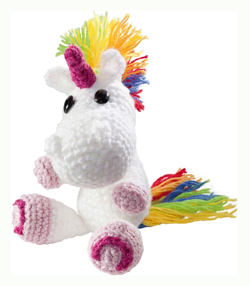 Този комплект за плетене на една кука е подходящ и за начинаещите любители, които искат да се запознаят с основните техники на плетенето. В комплекта са включени материали, достатъчни за изработката на 1 еднорог с големина 12-14 см, с помощта на 1 кука за плетене, 2 очички, 10 гр вата за пълнеж и памучна прежда в различни цветове.